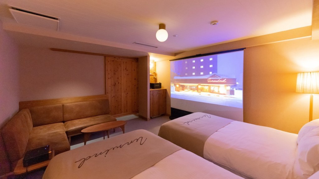 お部屋は大きなスクリーンが付いていて、お酒を飲みながら映画など楽しむことができます。